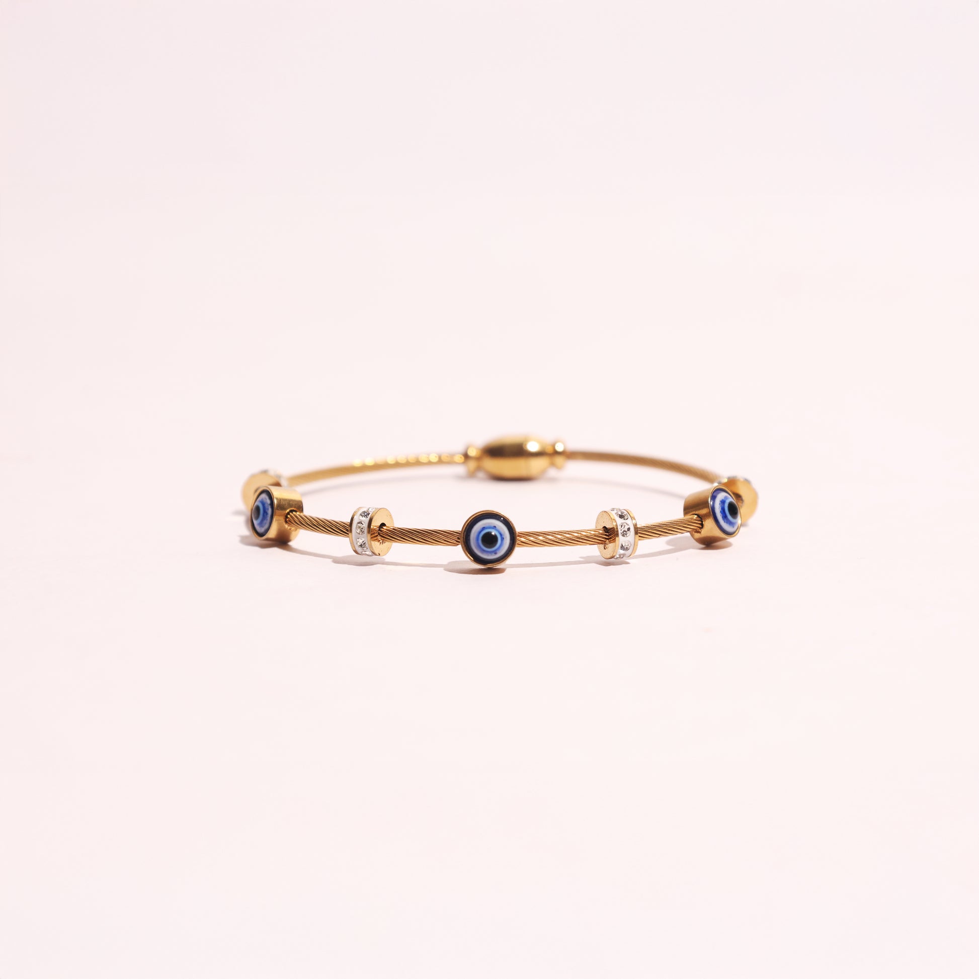 Elegant, meaningful, and timeless — the Evil Eye Bangle combines luxury design with the ancient symbol of protection. Featuring a gold-toned stainless steel cable band adorned with three vivid blue evil eye charms and shimmering crystal-studded spacers, this bracelet is crafted to ward off negativity while elevating your style.