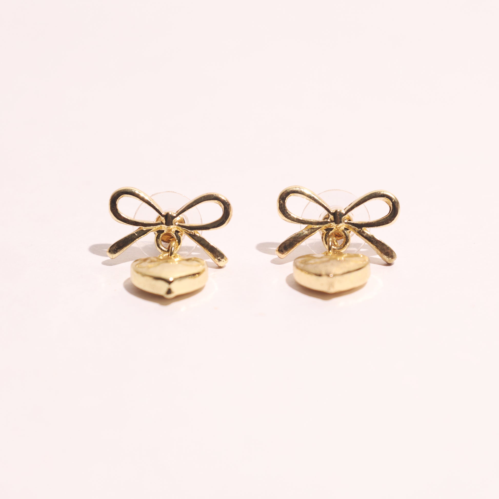 Keywords: gold bow earrings, heart drop earrings, dainty gold earrings, romantic jewelry, feminine gold studs, cute gold heart earrings, elegant drop earrings, gift for her, bow and heart charm earrings, timeless gold jewelry.