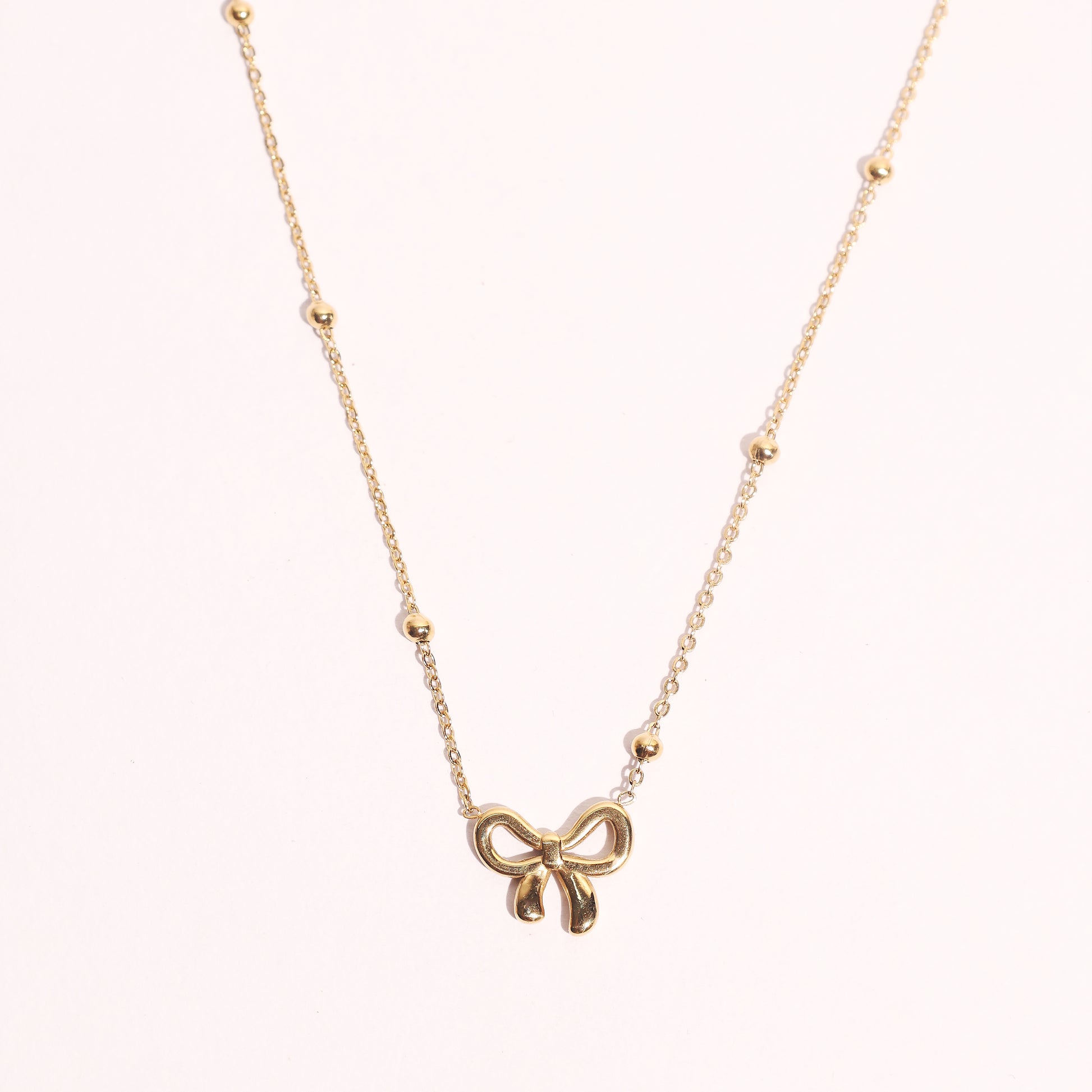The Stallae Golden Bow Pendant Necklace captures a perfect balance of elegance and playfulness. Featuring a delicately sculpted bow charm in a radiant gold-plated finish, it hangs gracefully from a fine beaded chain that adds subtle texture and charm.